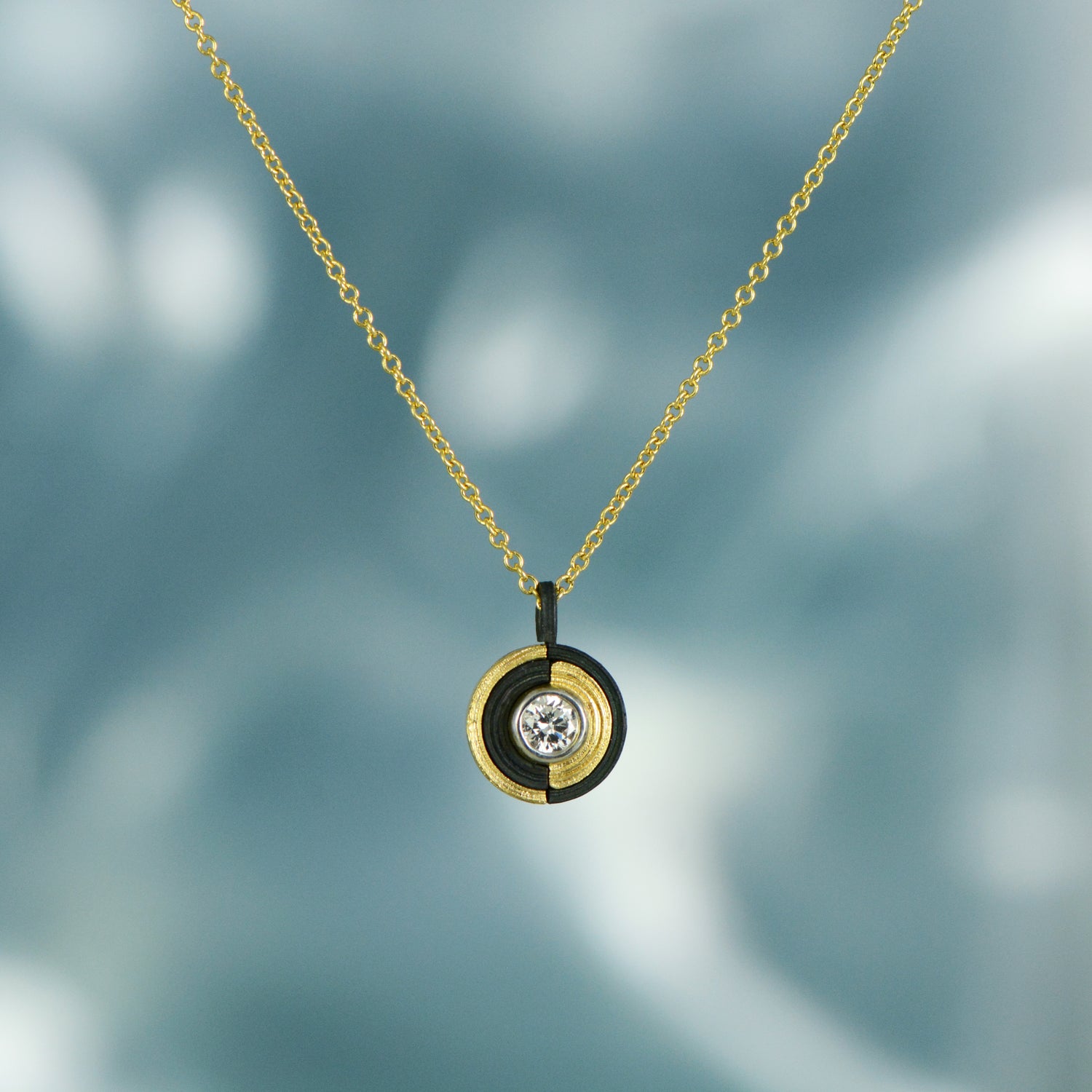 18K yellow gold and black cobalt chrome pendant with one round .15ct diamond.