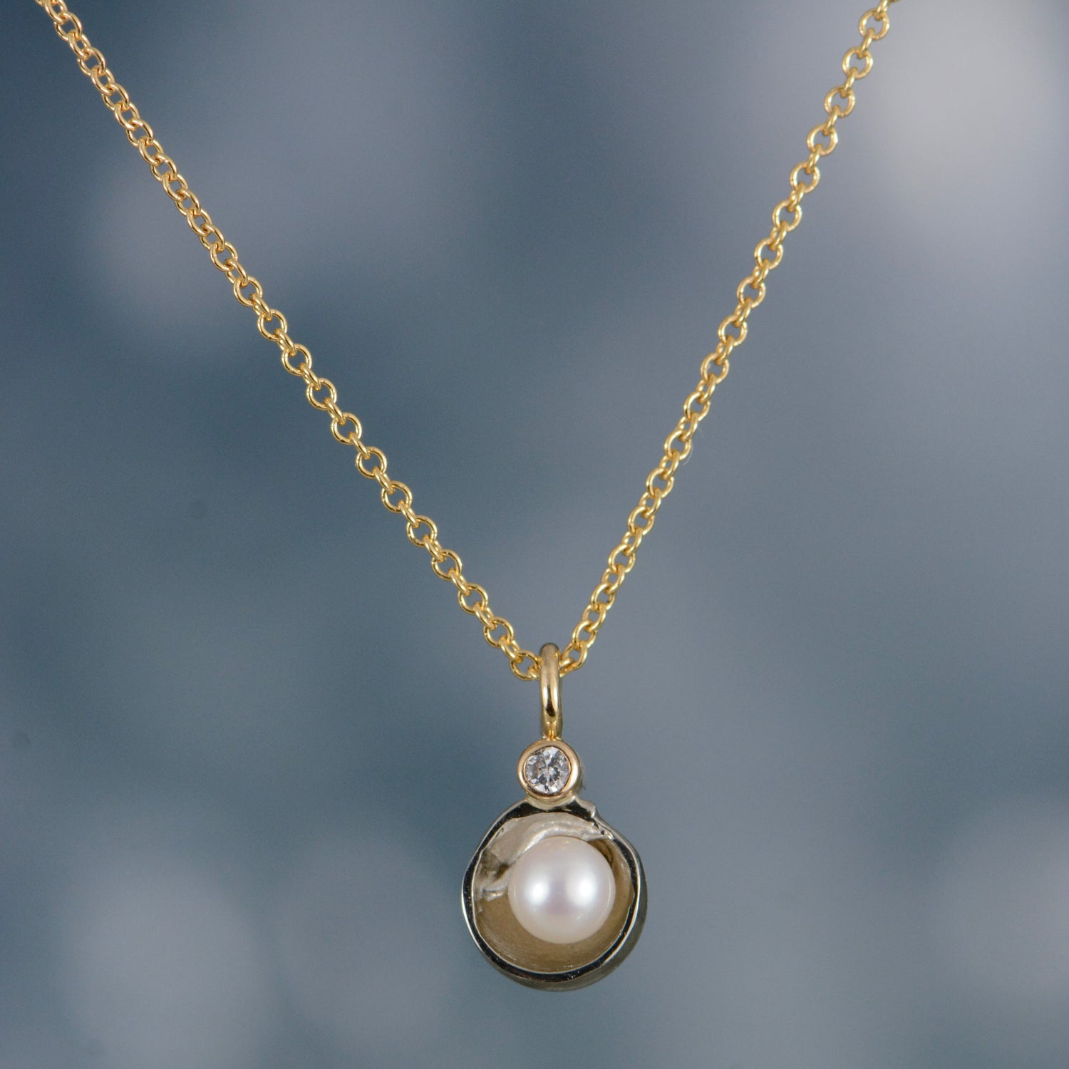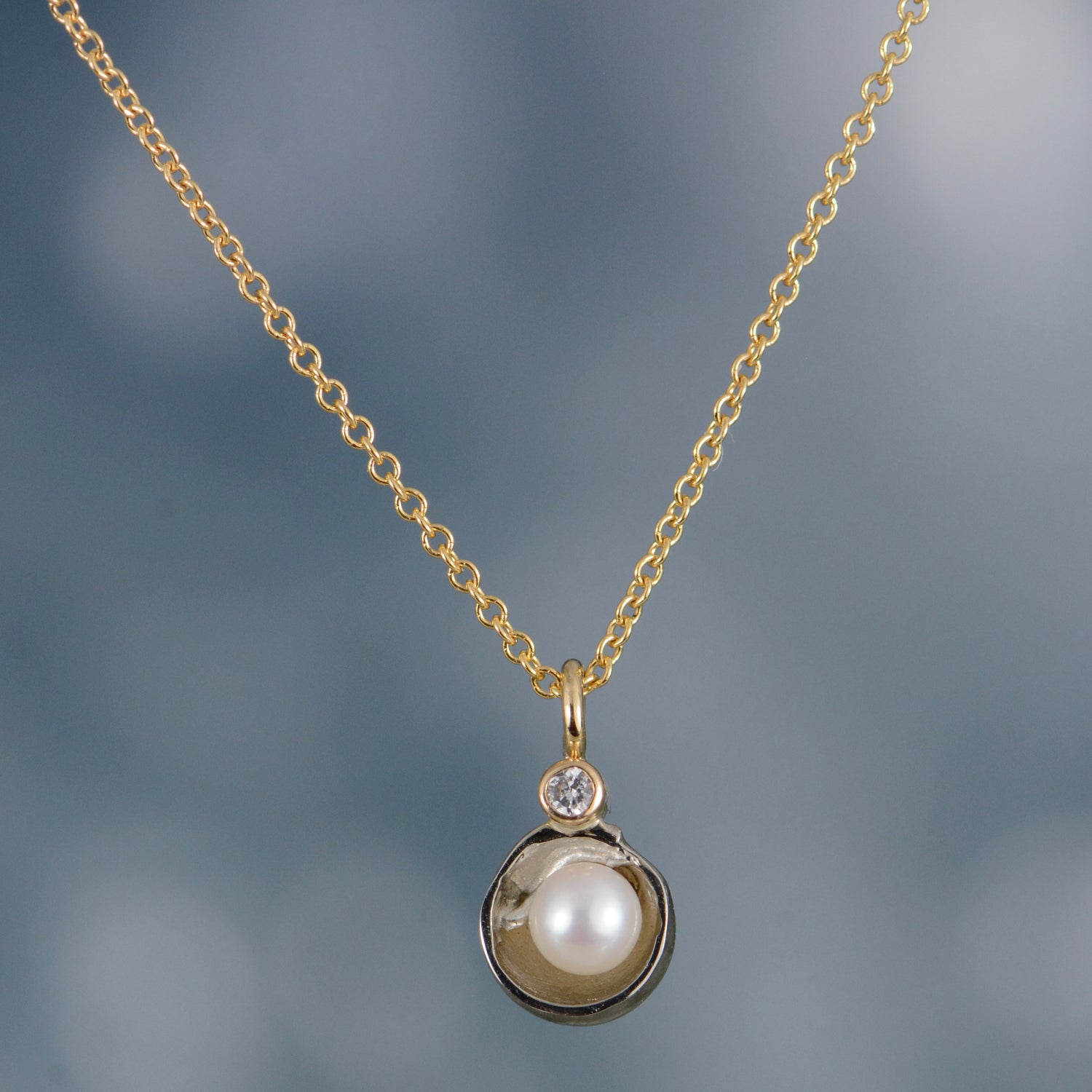 14K white and yellow gold cup pendant with a 4mm white pearl and one .02ct diamond, on a 14K yellow gold chain. Pendant size is approx. 12x7mm.