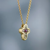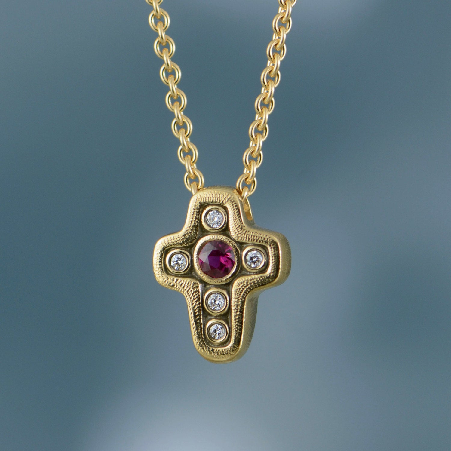 18K Yellow Gold Pendant one ruby (.15ct) and five diamonds (.15ct tw) on an 18" cable chain.