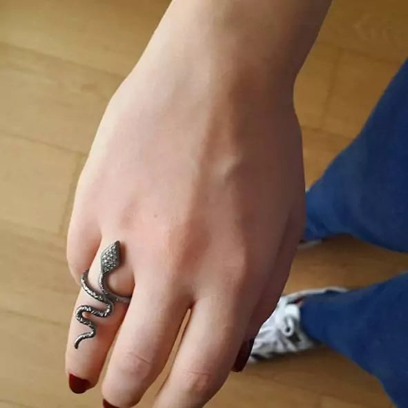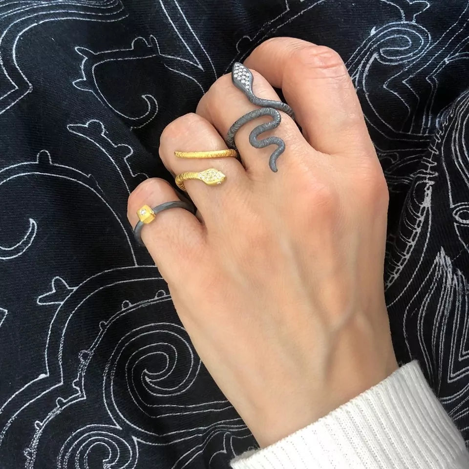 Oxidized sterling silver snake ring with white diamond head and green diamond eyes. .13ct tw white diamonds & .02ct tw green diamonds