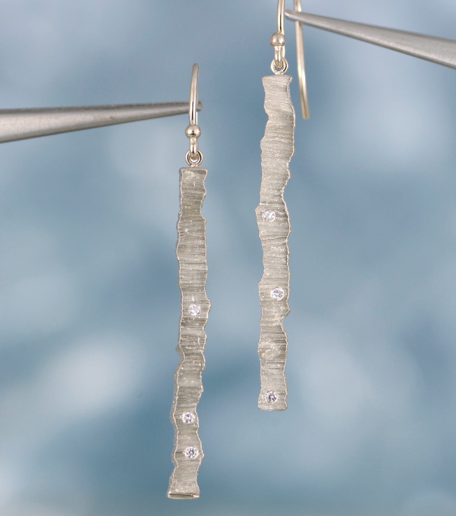14K white gold "bark" earrings with flush set diamonds. Six .005ct diamonds.
