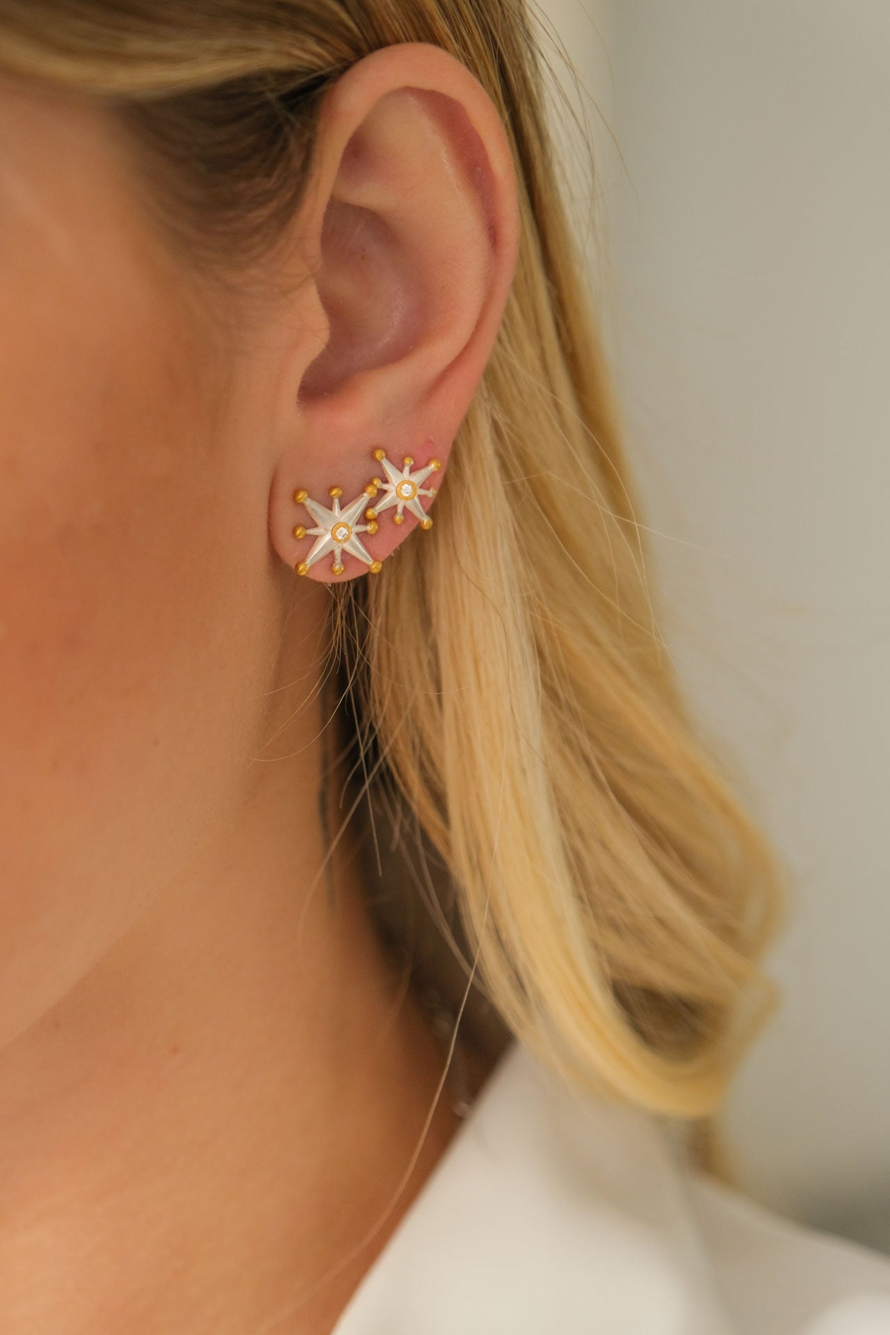22K GOLD & STERLING SILVER STARBURST STUDS, DIAMONDS, 18k posts & small backings, 9MM