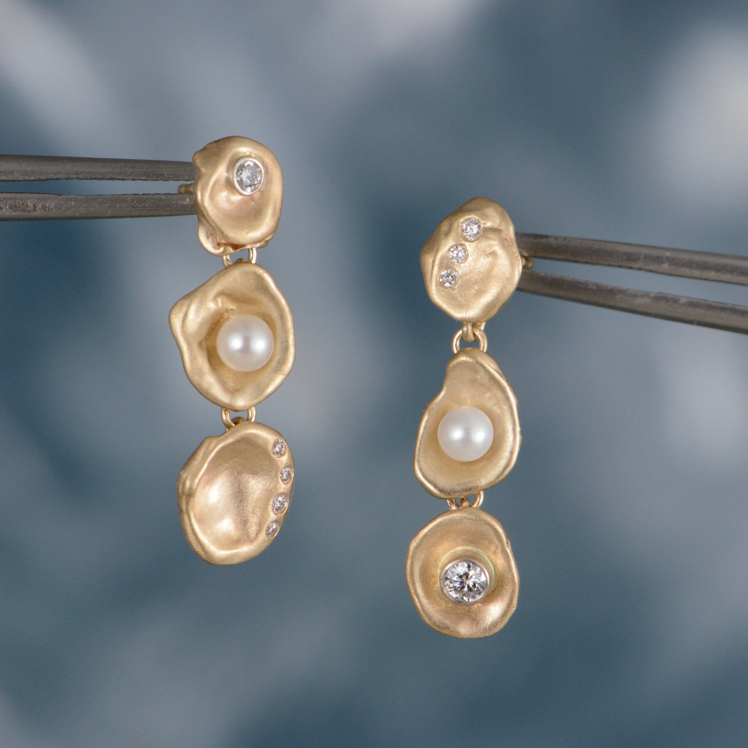 14K yellow gold triple drop earrings with diamonds and white pearls. Approx. .14ct total weight.