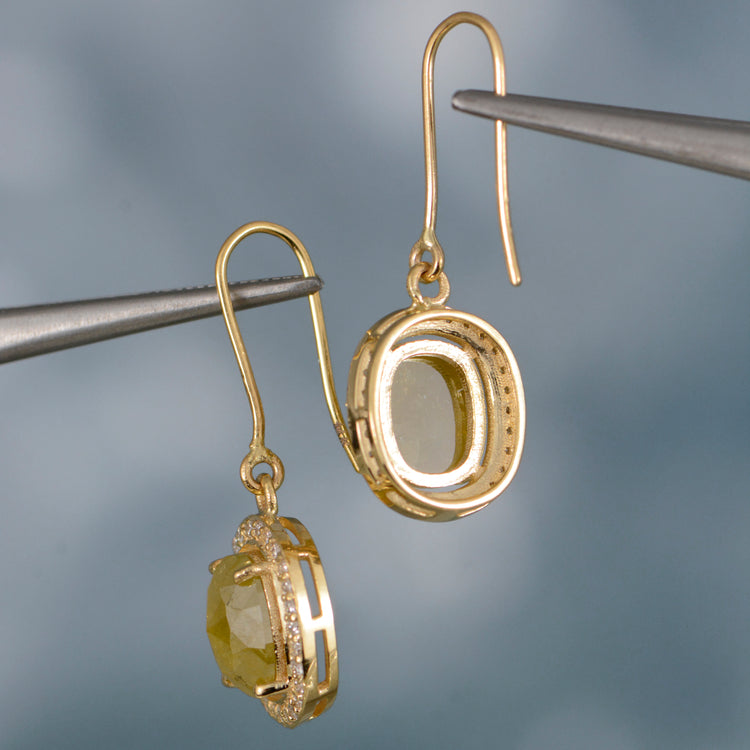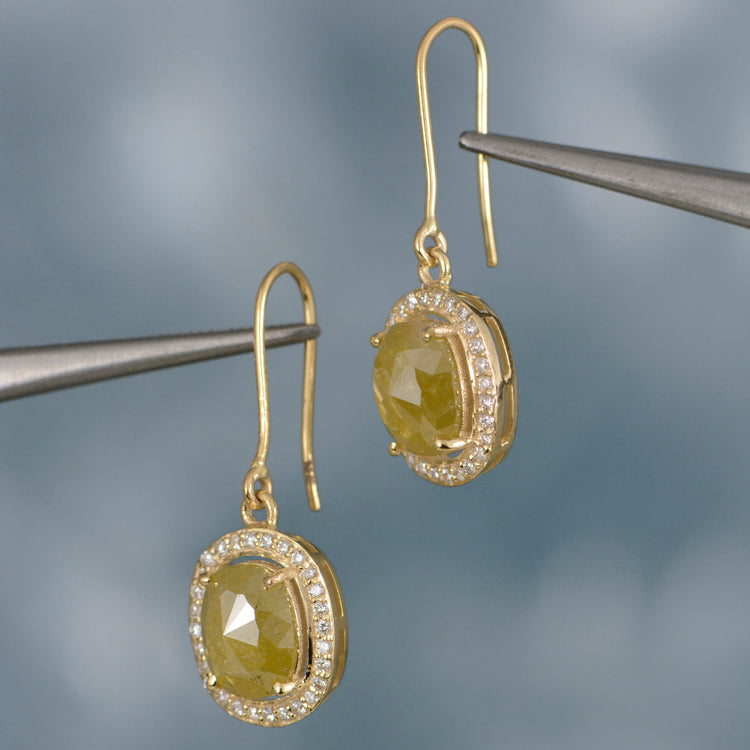 14K yellow earrings with 3.03ct total weight fancy rose cut yellow diamonds surrounded by a white diamond halo.
