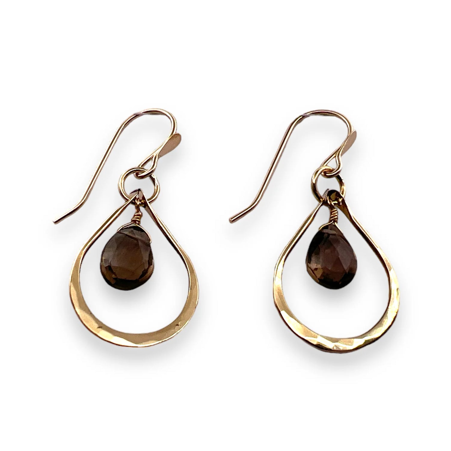 Hand hammered 14kt gold fill earrings with briolette cut smokey quartz