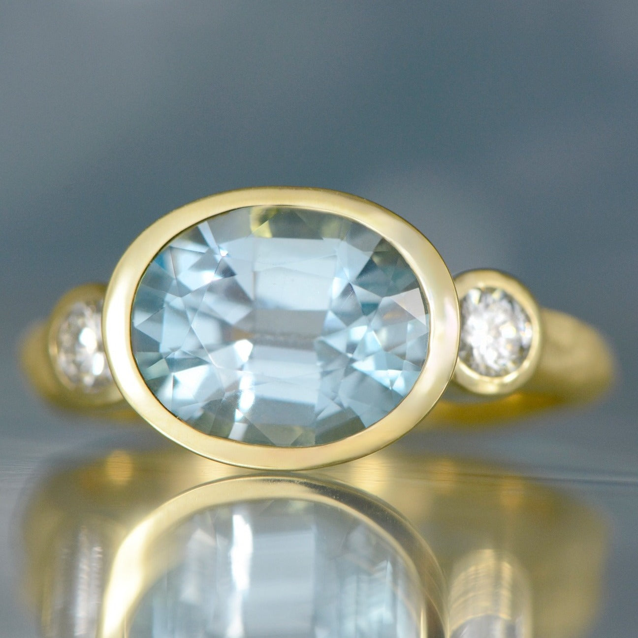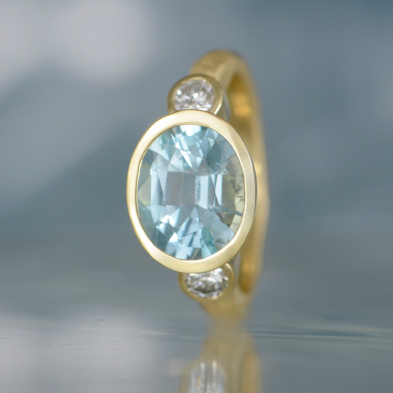 14K yellow gold ring with an oval aquamarine (3.76ct) and two .17ct round diamonds. Finger size 6 1/2.