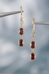 14K yellow gold drop earrings with garnet and diamonds.