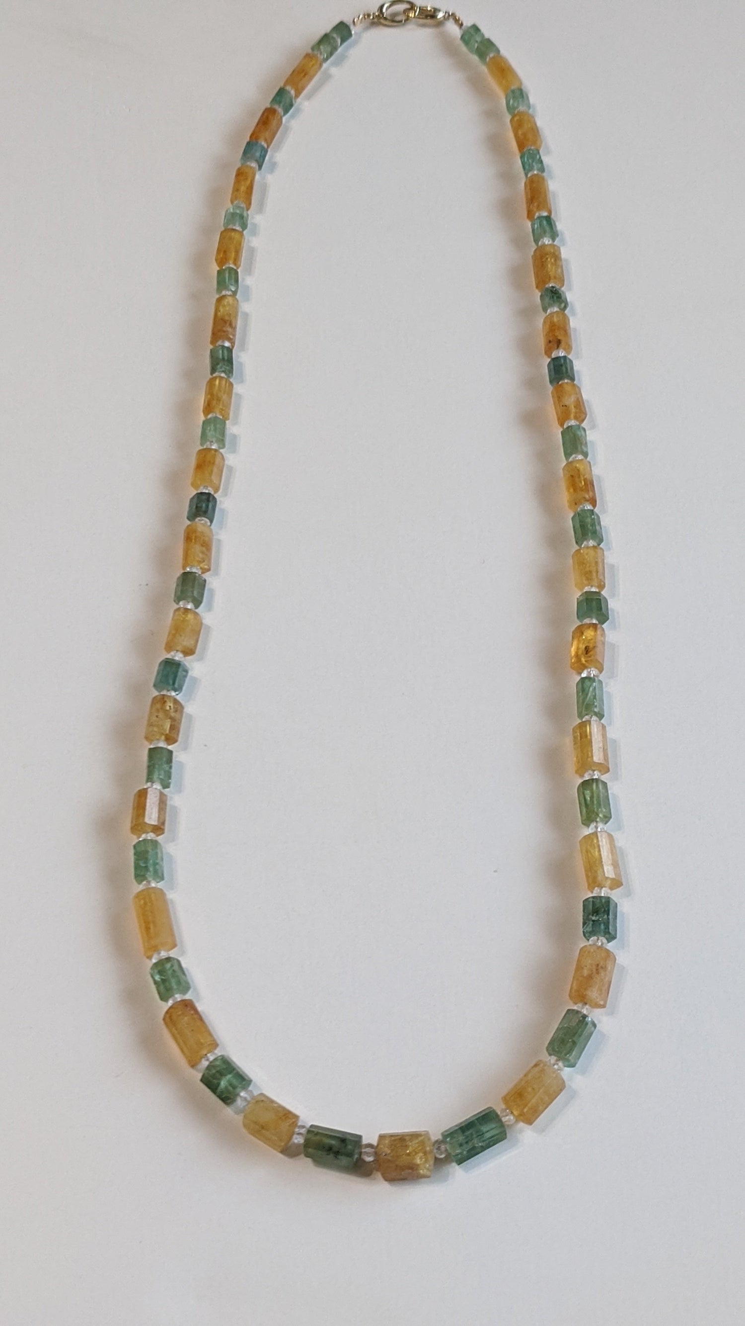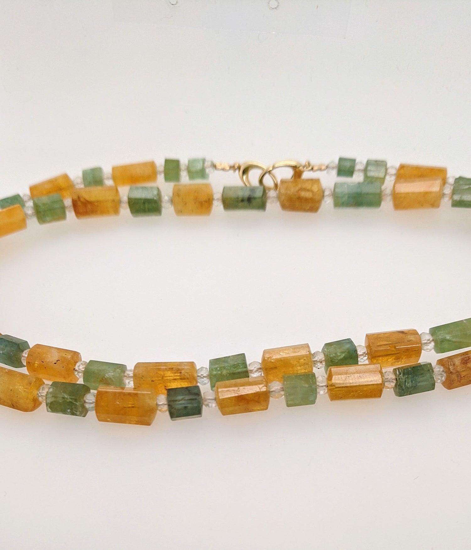 Citrine and Green Beryl rough cut beads with faceted white quartz and a 14K yellow gold clasp. Approx. 26"