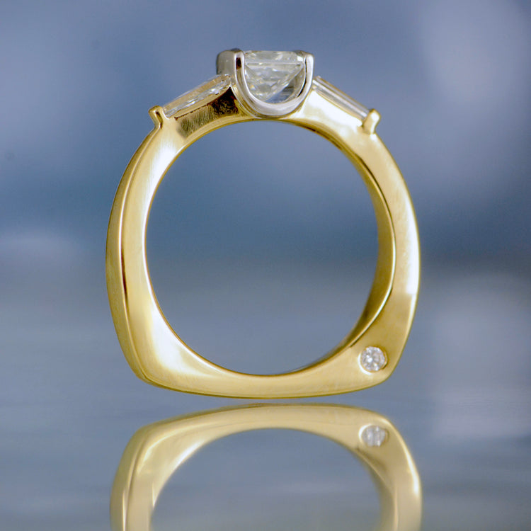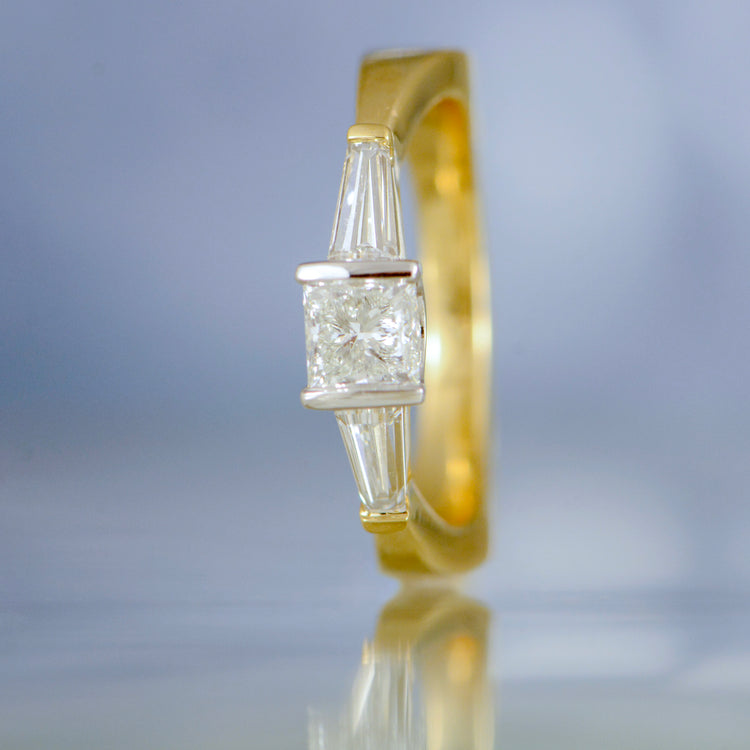 18K yellow and 14k white gold ring with one .59ct princess diamond, two .20ct each tapered baguette diamonds, and two .02ct round diamonds. Finger size 6-1/2.