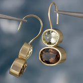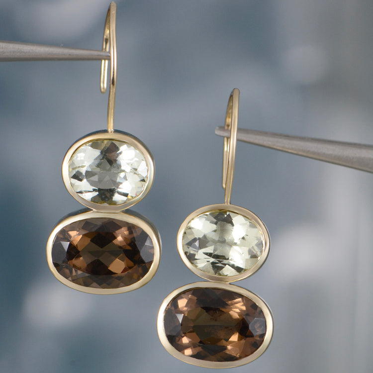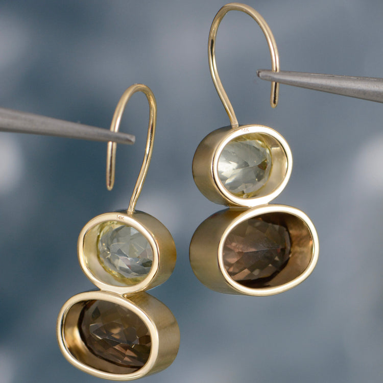 14K yellow gold bezel earrings set with lemon quartz and smoky quartz.