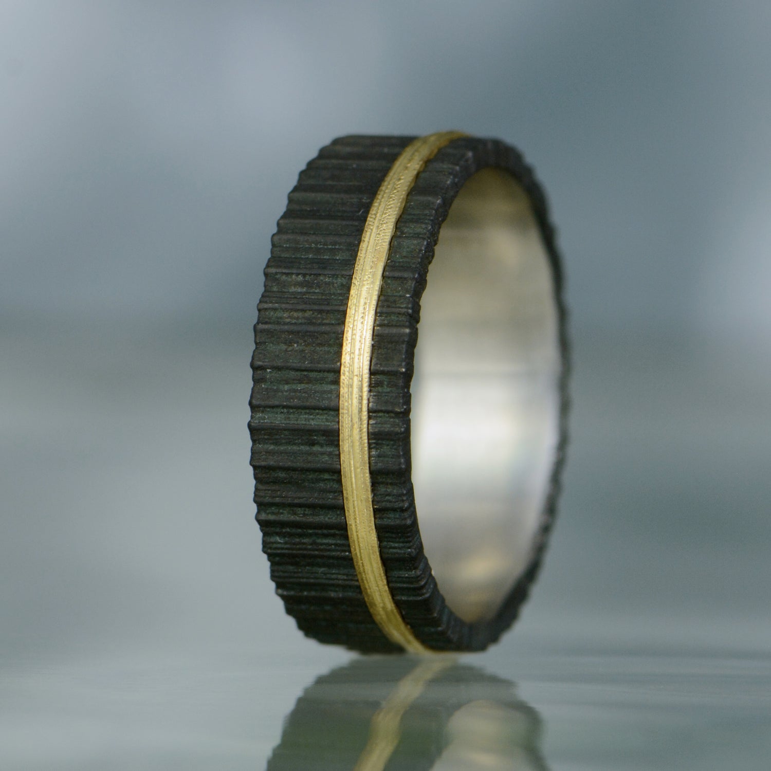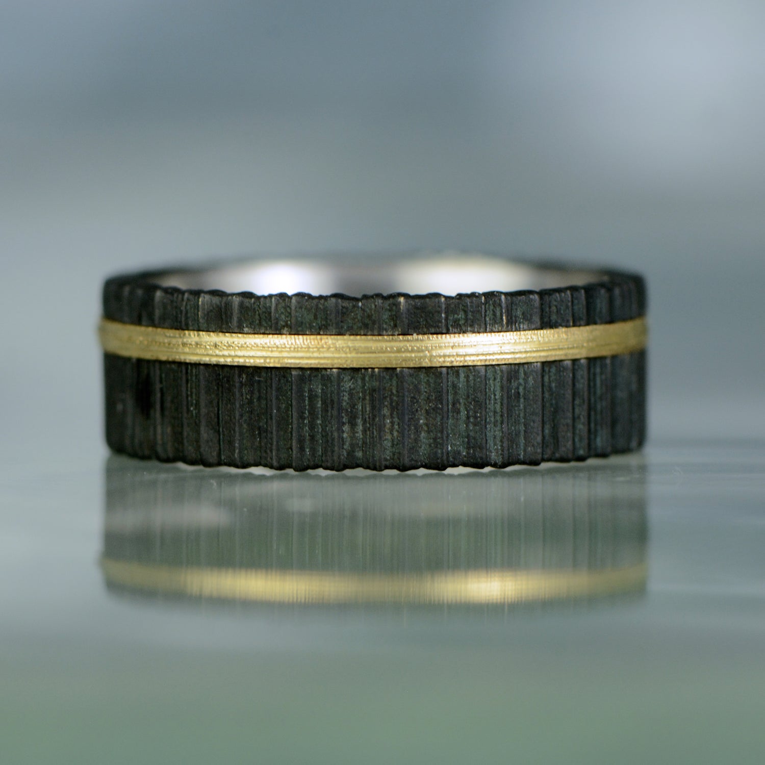 7.3mm oxidized cobalt chrome with an 18K yellow gold stripe. Finger size 10