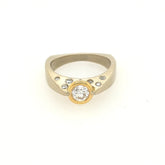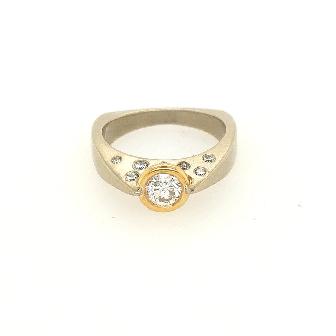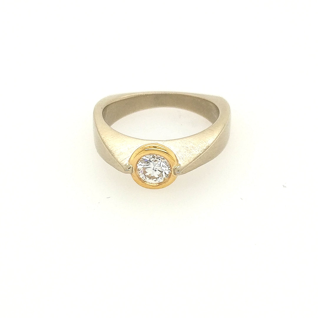 14K white gold ring with yellow gold bezel around a .33ct round diamond, with .11ctw of flush-set round diamonds on one side. Finger size 5-3/4. A great engagement ring or right hand ring.