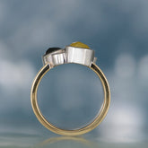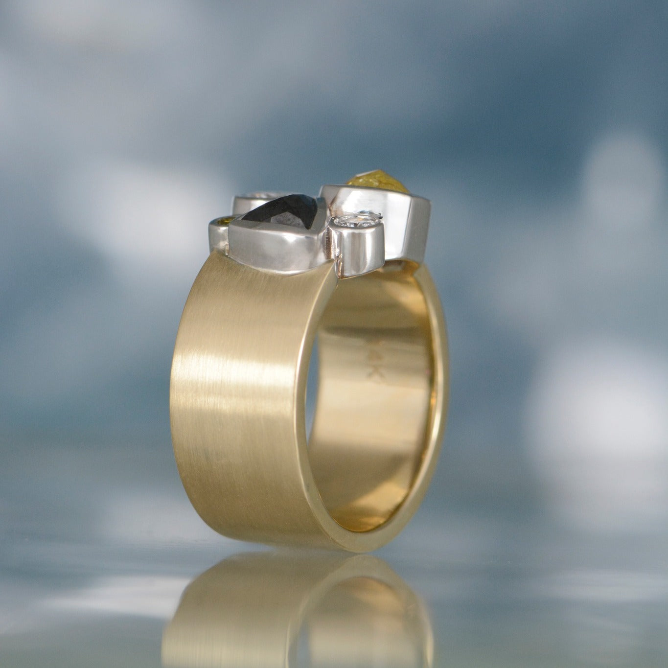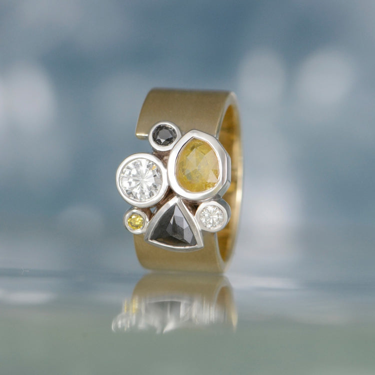 14K yellow and white gold ring with bezel set yellow, white, and black diamonds. Finger size 7 1/2.