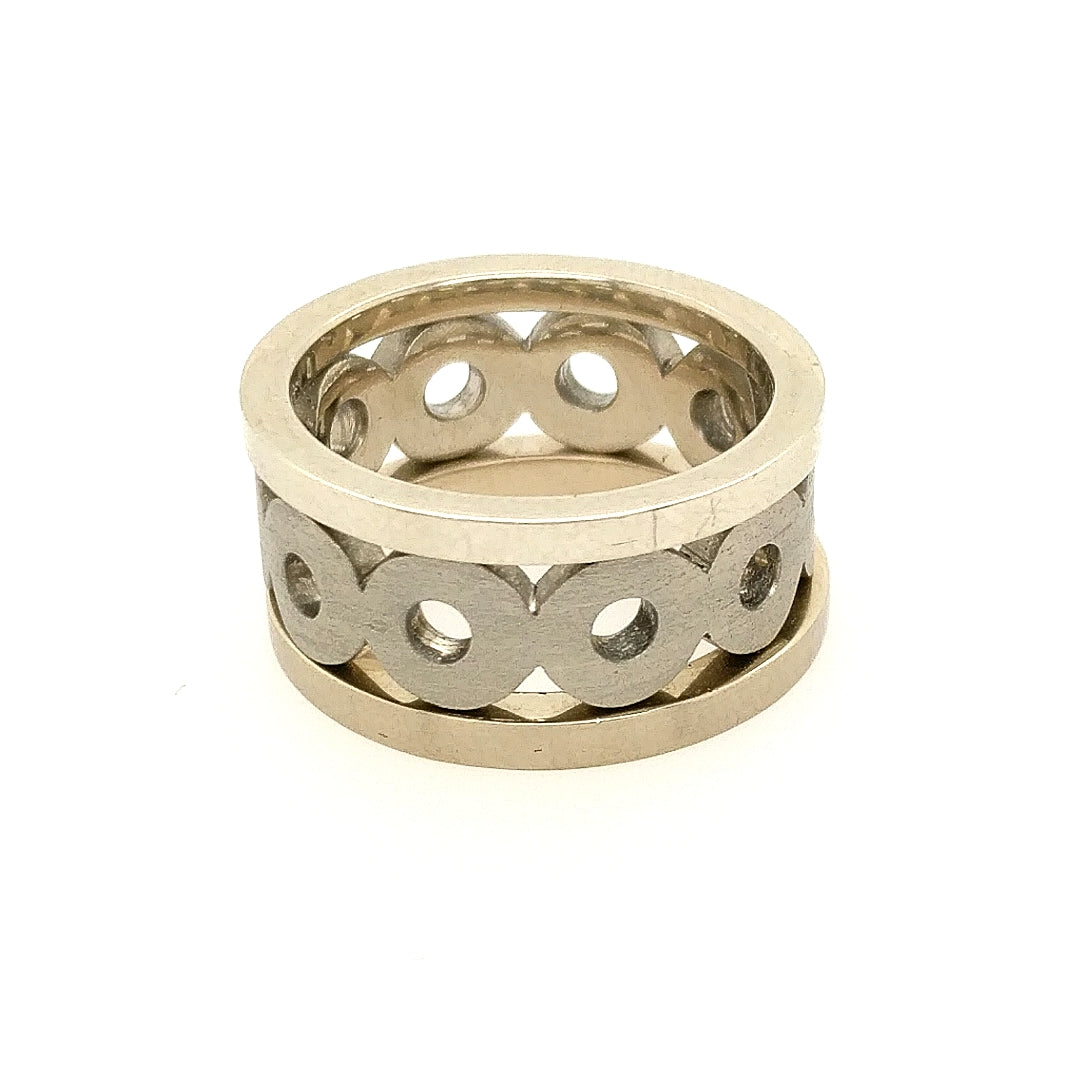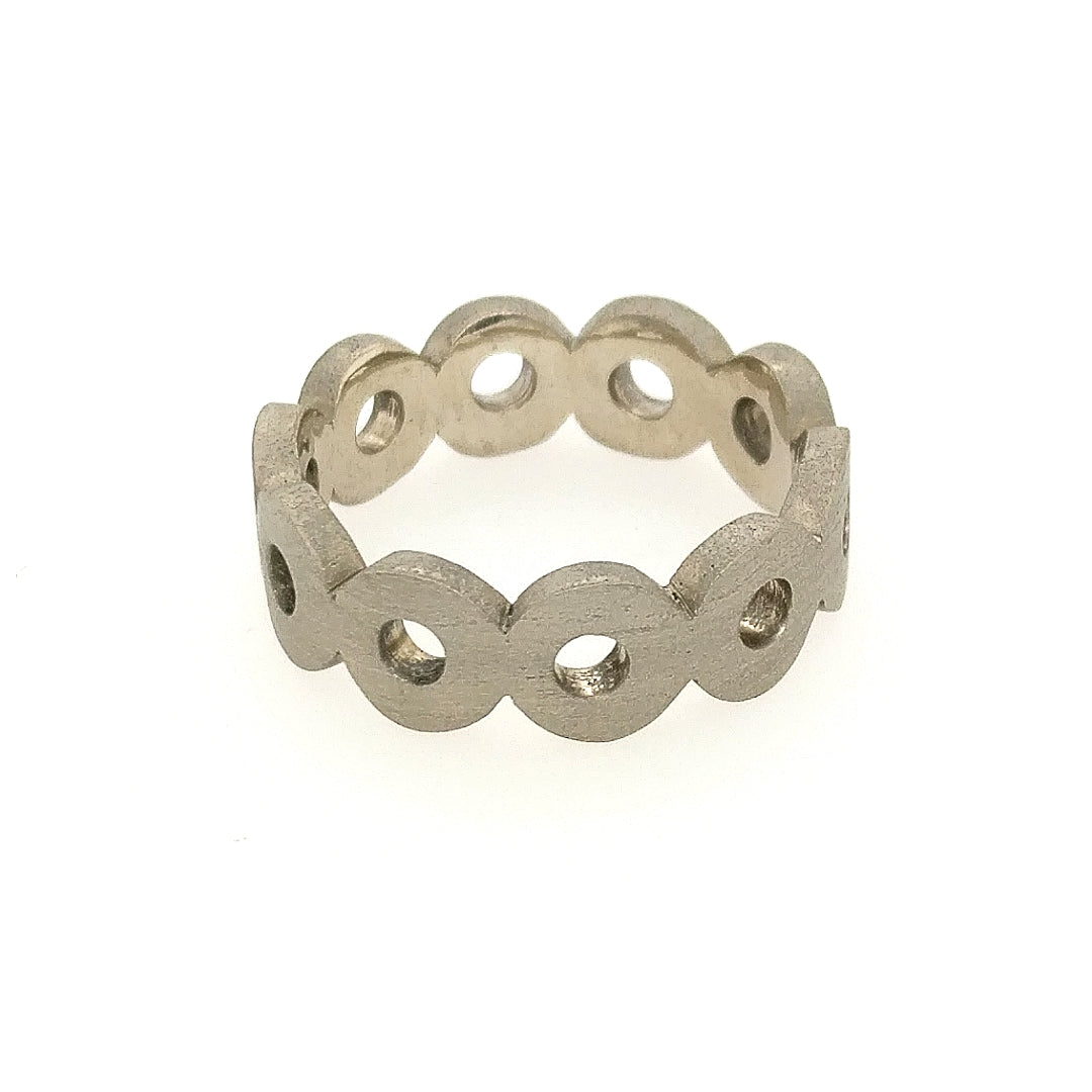 14K white gold circles band. Finger size 6-3/4. (Also shown stacked with flat white gold bands)