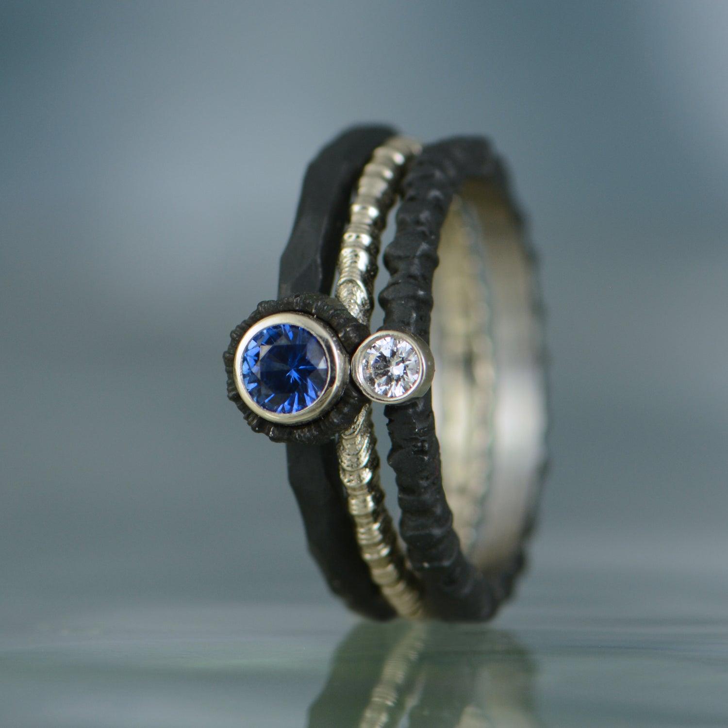 18K white gold and oxidized cobalt chrome stacking ring with .36ct blue sapphire and .05ct white diamond. Finger size 7. Shown stacked with Sarah Graham cobalt chrome bands (sold separately).