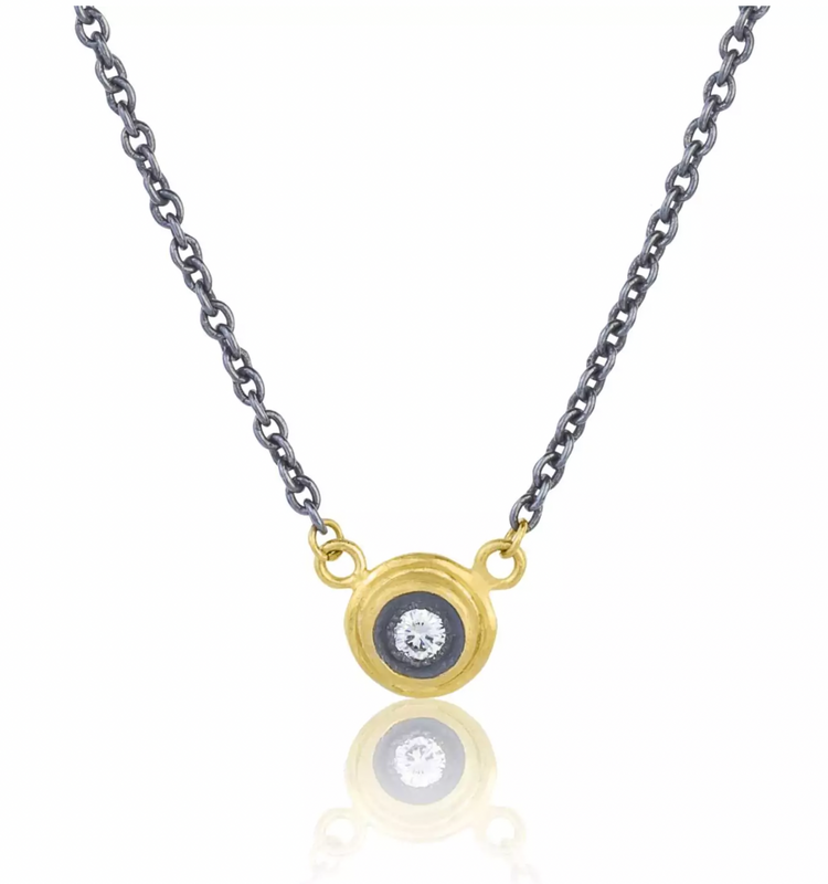 OXIDIZED SILVER AND 24K GOLD “KRISTA” SINGLE DIAMOND NECKLACE ON AN OXIDIZED SILVER ADJUSTABLE CHAIN 16″-18″, .09ct