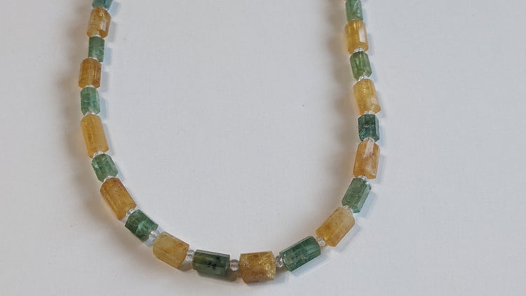 Citrine and Green Beryl rough cut beads with faceted white quartz and a 14K yellow gold clasp. Approx. 26"