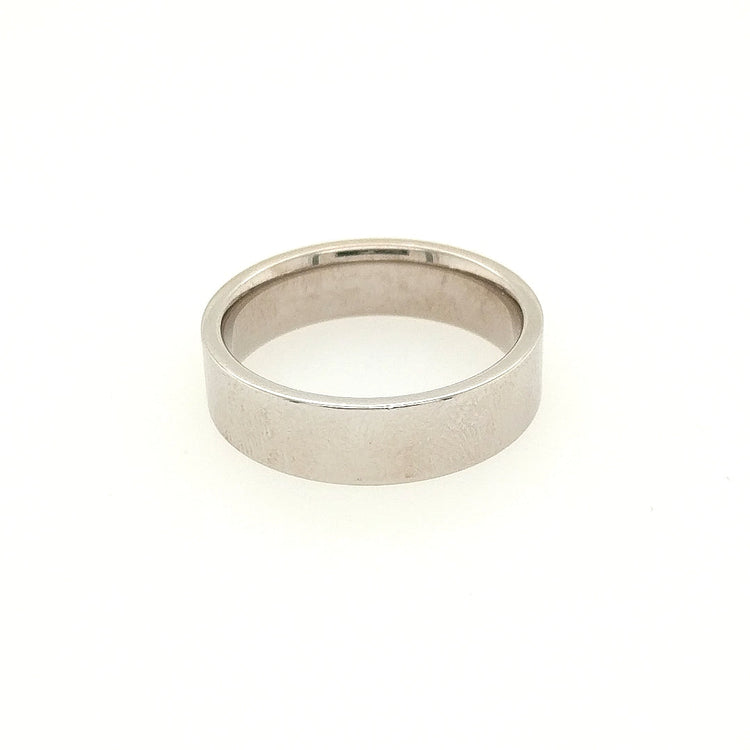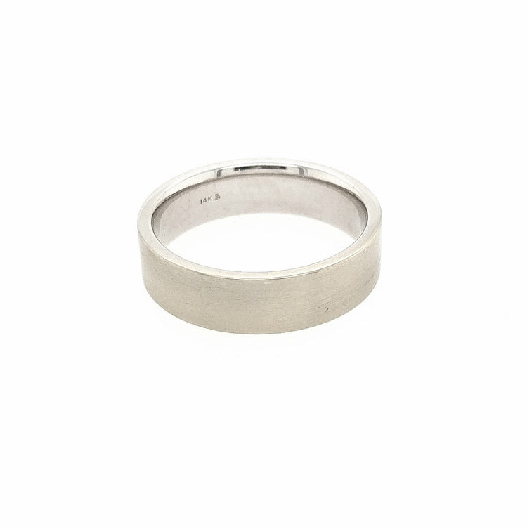 14K white gold, 6mm wide comfort-fit band. Available with high polish or matte finish. Finger size 10.