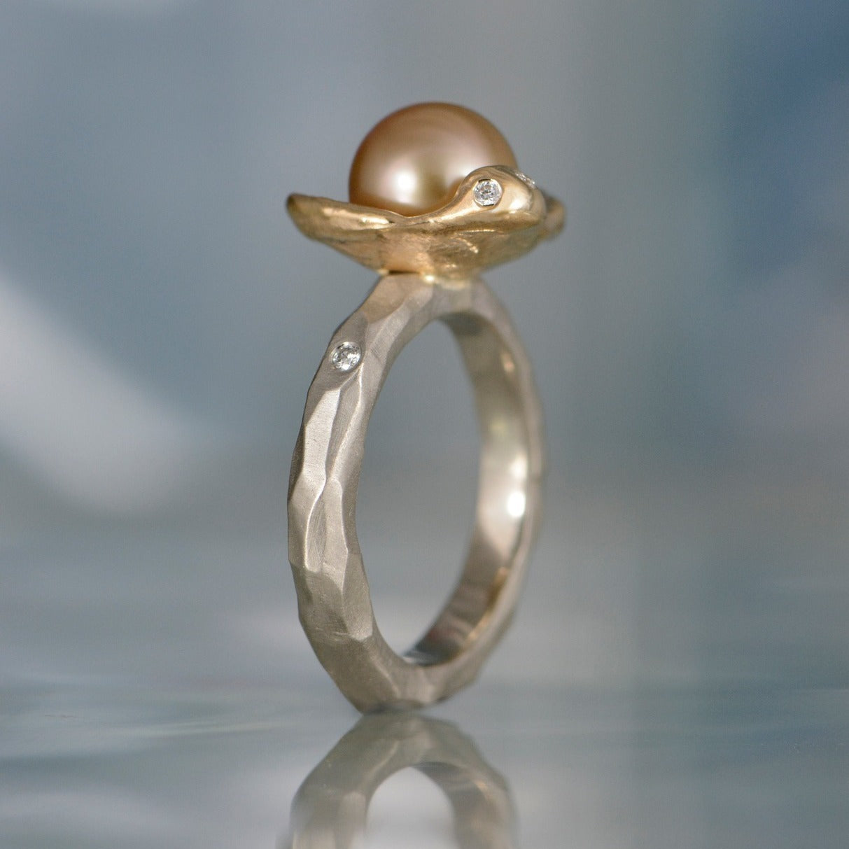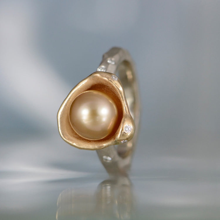 14K yellow and white gold ring with a golden south sea pearl and flush set diamonds (6 total diamonds). Finger size 6.