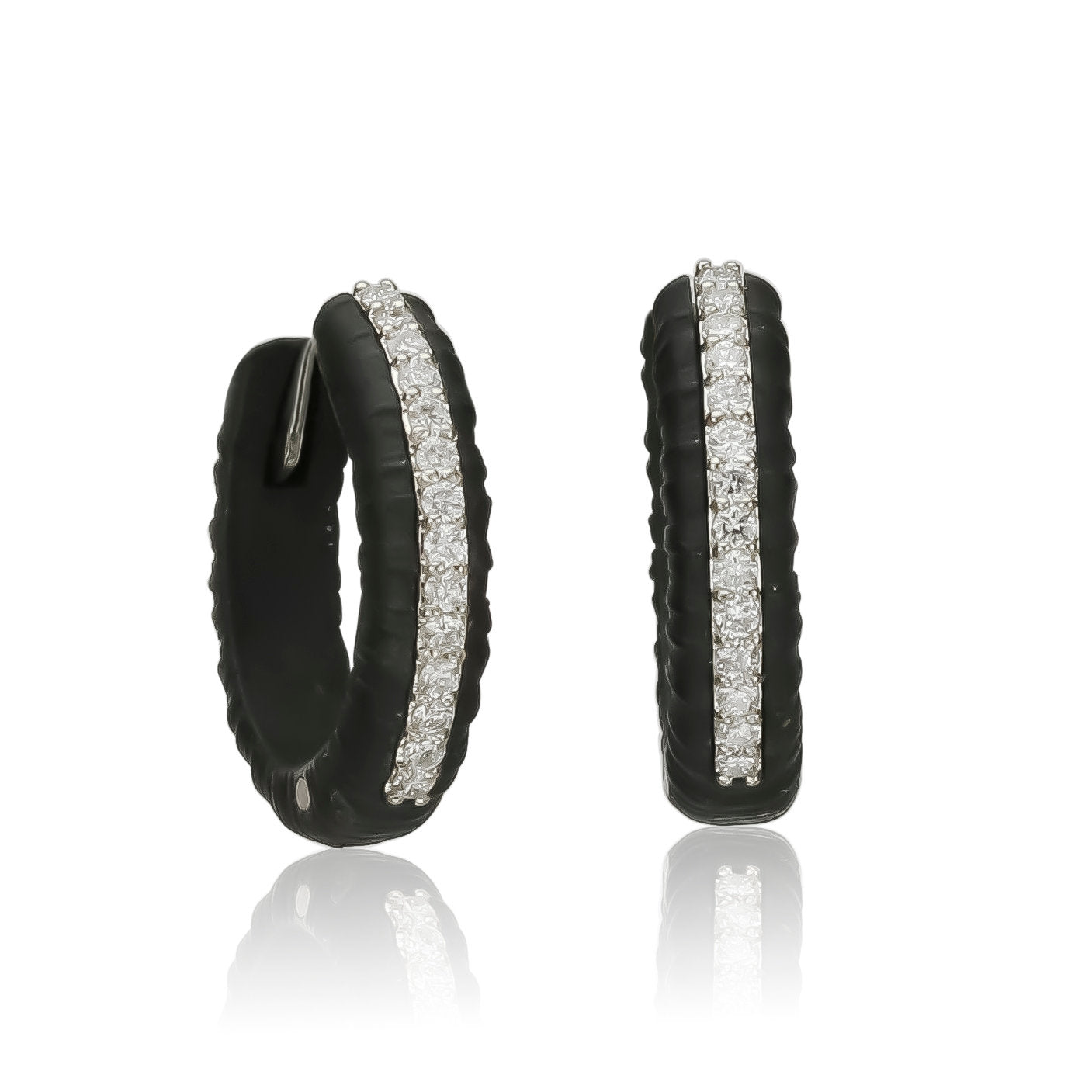 Ridge Hinged Hoop Earrings with .34 ct tw pave set white diamonds in 18K gold and oxidized cobalt chrome, 19mm