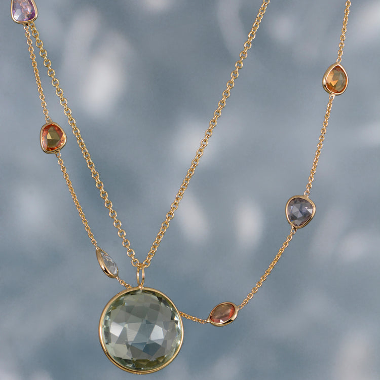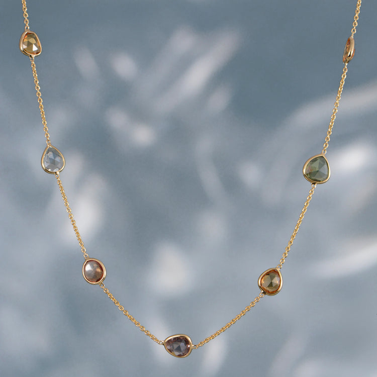 18K yellow gold rose cut multi-color sapphire slice station necklace. 18 inches. (Second picture shows it layered with green amethyst pendant, sold separately)