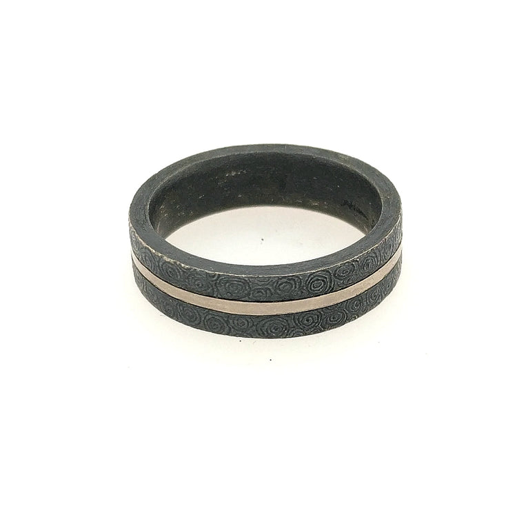 Oxidized sterling silver and palladium ring with scroll design. Finger size 9-1/2.