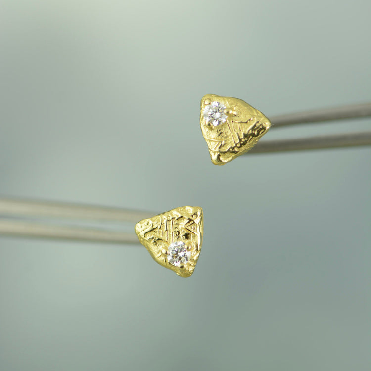 18K yellow gold trigon stud earrings with .10ct trillion diamonds. Approx. 7.5mm wide.